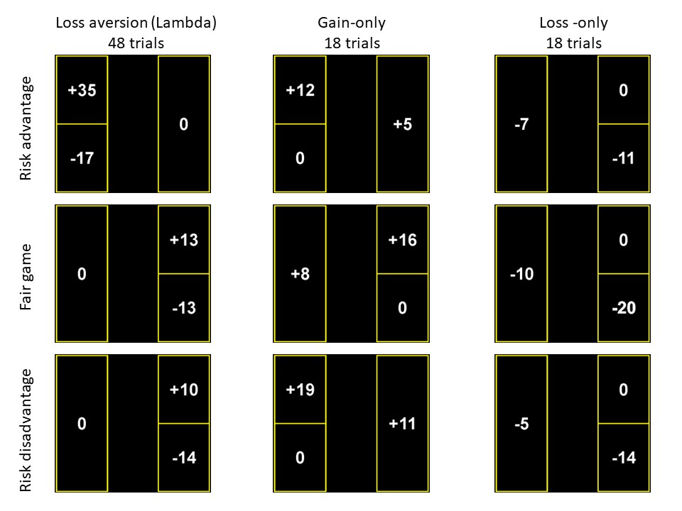 We presented nine different scenarios to the participants, as shown in the figure on the left, and used these behavioral data to caculate their lambda by fitting a logistic function.