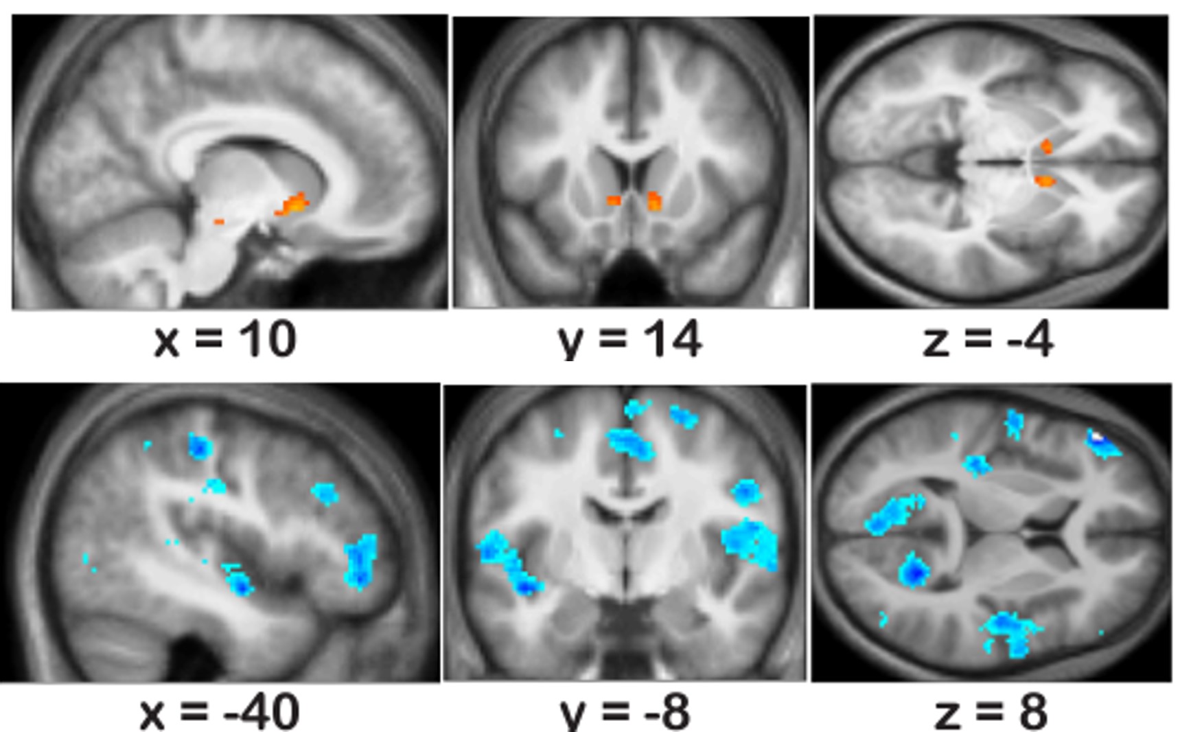 We fitted a general linear model (GLM) consisting five regressors (gamble, no gamble, win, loss, guaranteed outcome) to the BOLD signal and contrast the win and loss feedback images with the guarantee outcome image. Specifically, we are interested in how individual reacted to the gambling outcome, and how it related to people’s loss aversion.